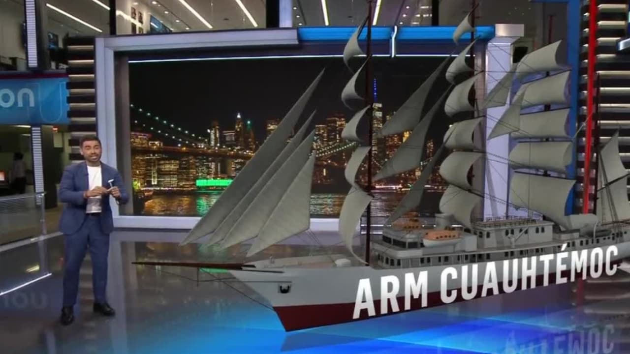 El mástil principal del buque escuela Cuauhtémoc mide 147 pies de altura mientras que el puente de Brooklyn tiene una altura libre de navegación de 135 pies. Te mostramos en realidad aumentada cómo es esta embarcación y por qué estas medidas son clave para determinar cómo se pudo haber ocurrido el accidente.
