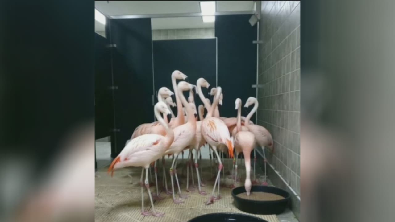 Empleados del Jardín Botánico 'Sunken Gardens', en la ciudad de St. Petersburg, Florida, se refugiaron en los baños con los flamencos para salvarlos del huracán Ian. Estos jardines existen desde hace más de un siglo y son una de las atracciones turísticas de carretera más antiguas de Estados Unidos.