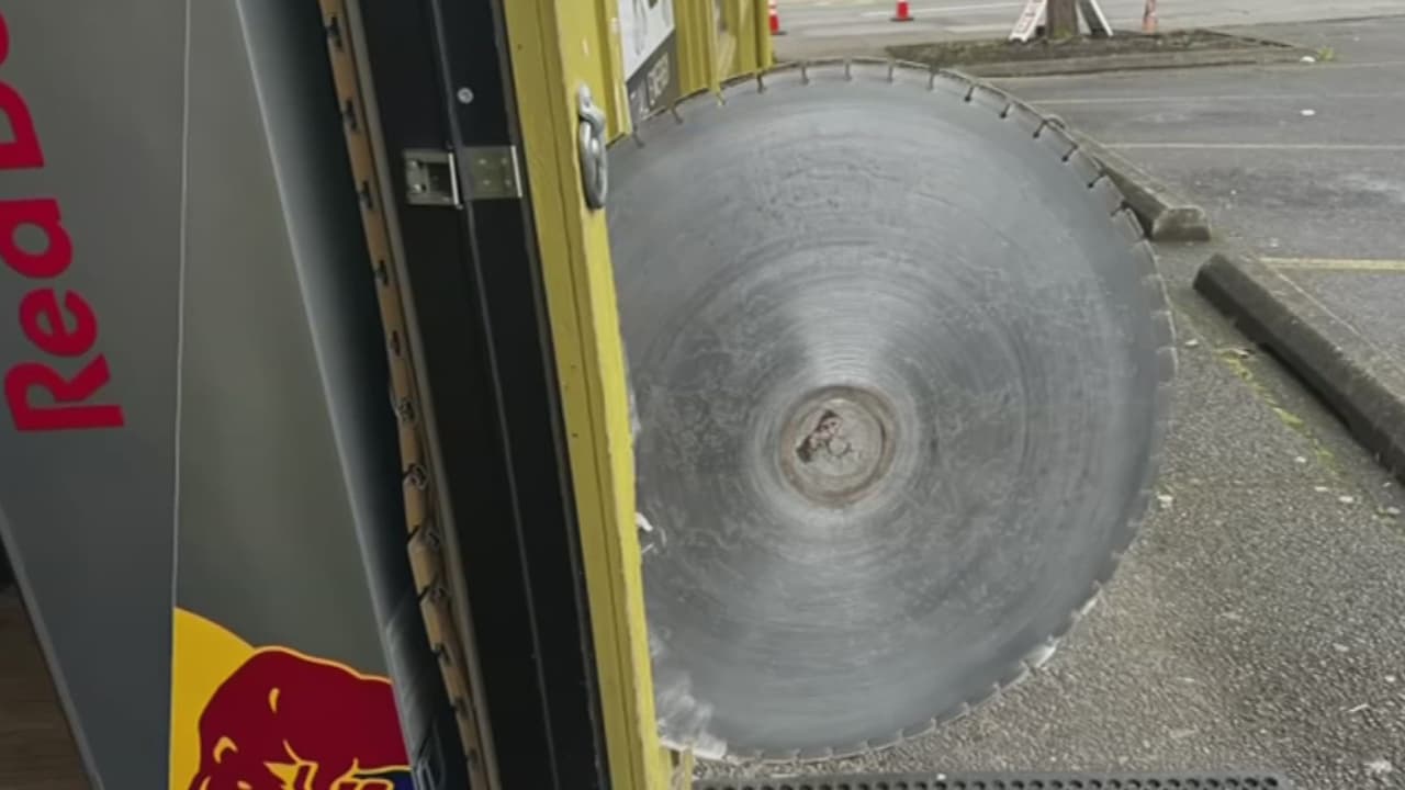 Una cámara de seguridad captó el momento en que un hombre ingresa a una tienda en Oregon y segundos después una sierra fuera de control atraviesa un estacionamiento y termina incrustada en la puerta del establecimiento.