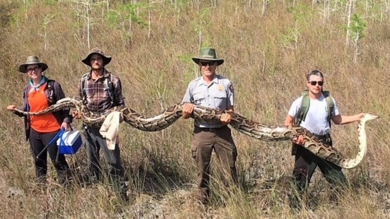 Una pitón enorme, de 17 pies de largo, fue capturada por un grupo de científicos en Florida
