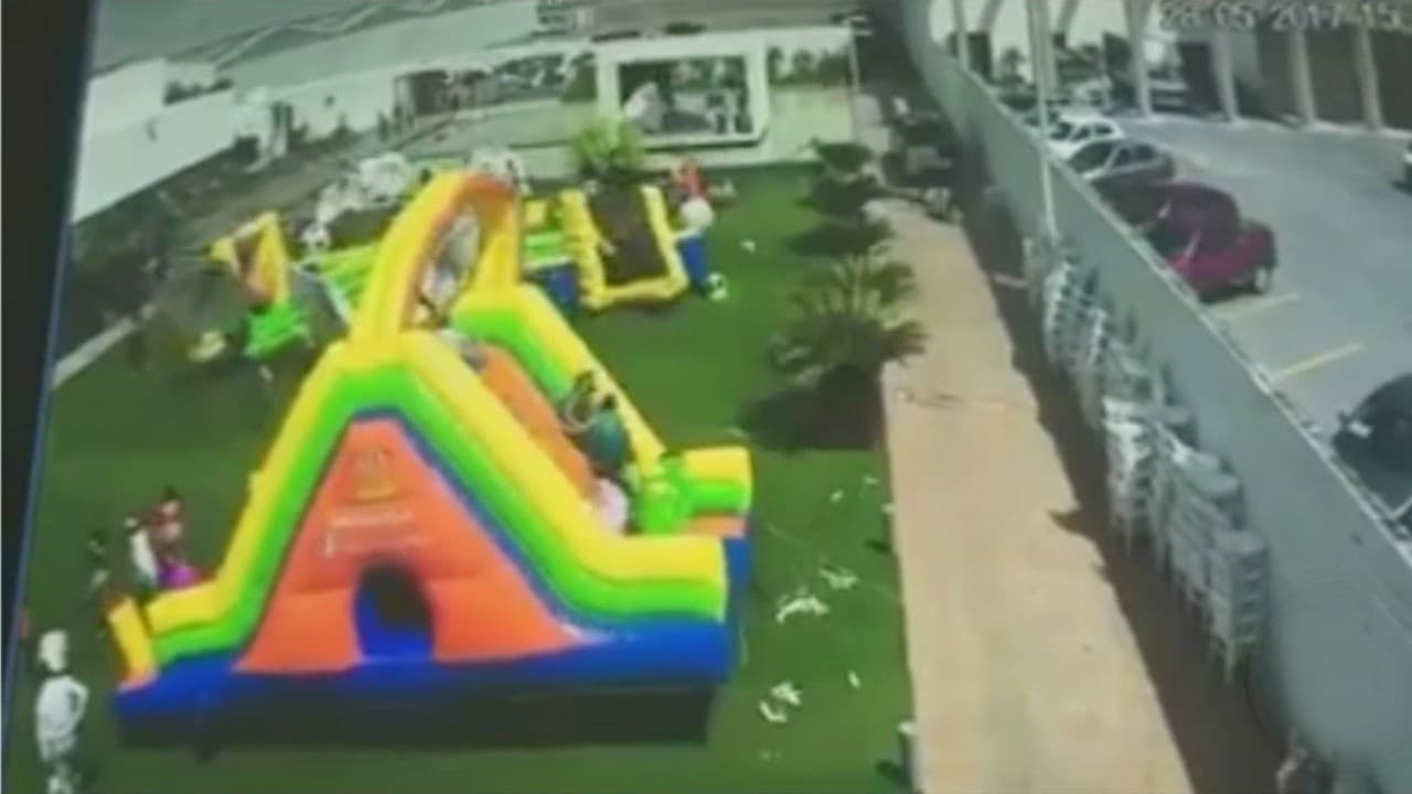 Los niños jugaban en los inflables, dentro de un centro de eventos en San Luis Potosí, México. El fuerte viento los sorprendió, y aunque algunos alcanzaron a bajar, otros fueron arrastrados. Uno de los juegos incluso salió volando del lugar, dejando a una niña de siete años en condición delicada de salud.