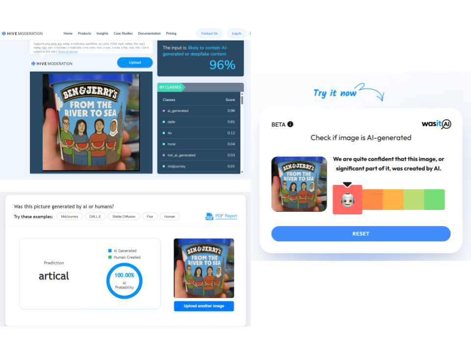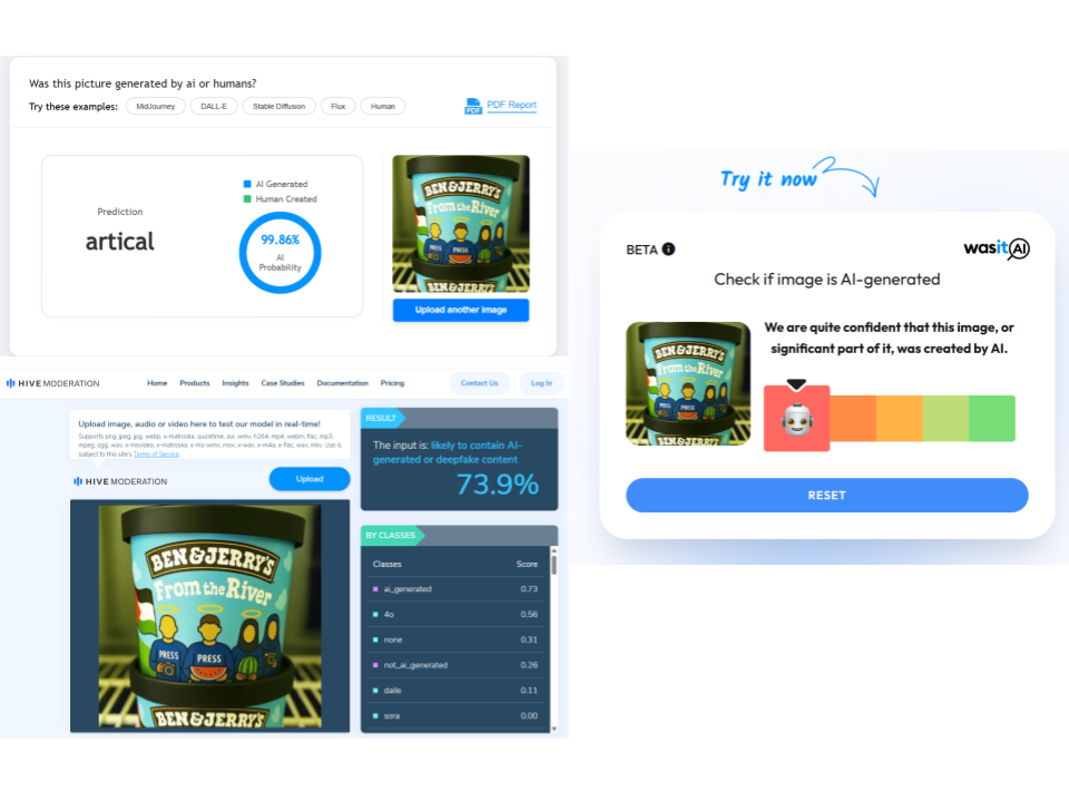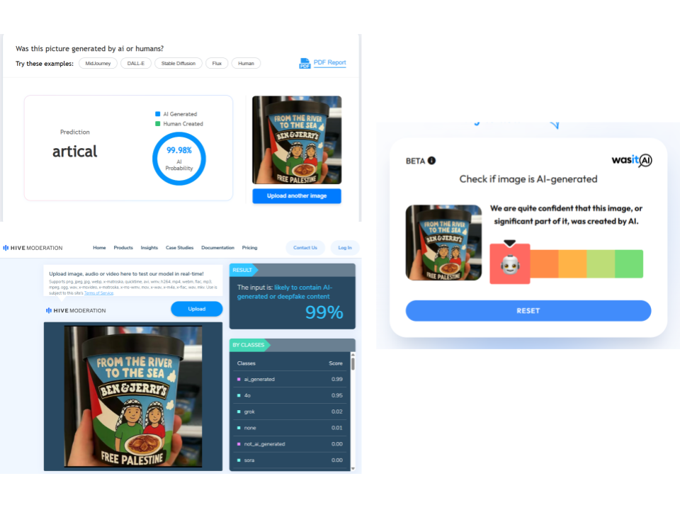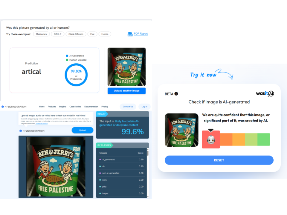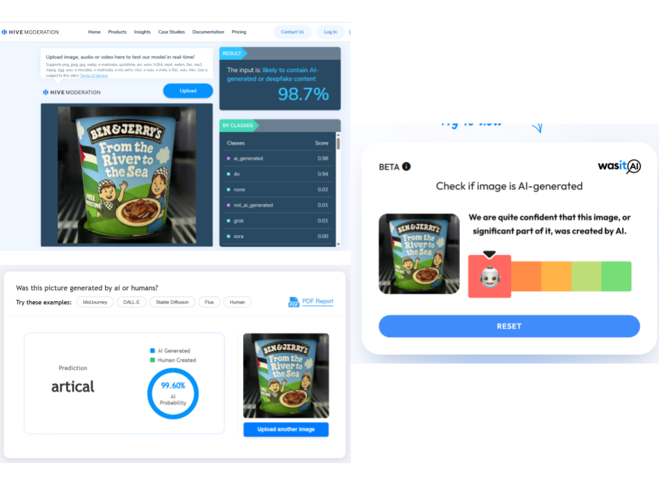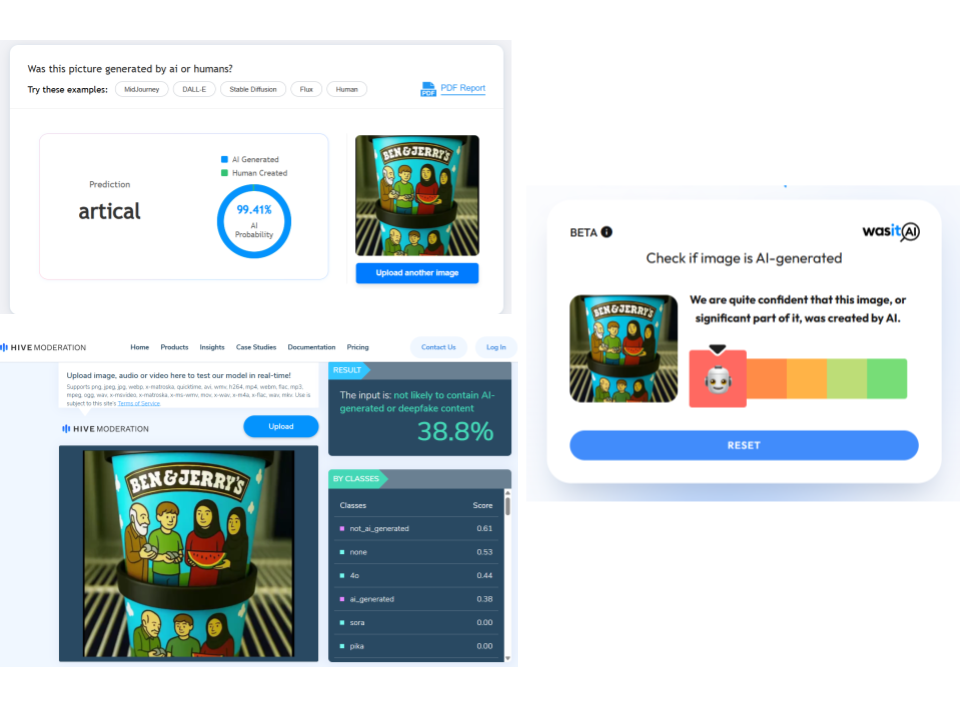 Ante la particularidad de la propuesta y la diferencia entre los trazos de uno y otro cartón de los supuestos helados, pasamos las imágenes por tres distintas herramientas de detección de IA: WasitAI, Hive Moderation y Decopy AI.