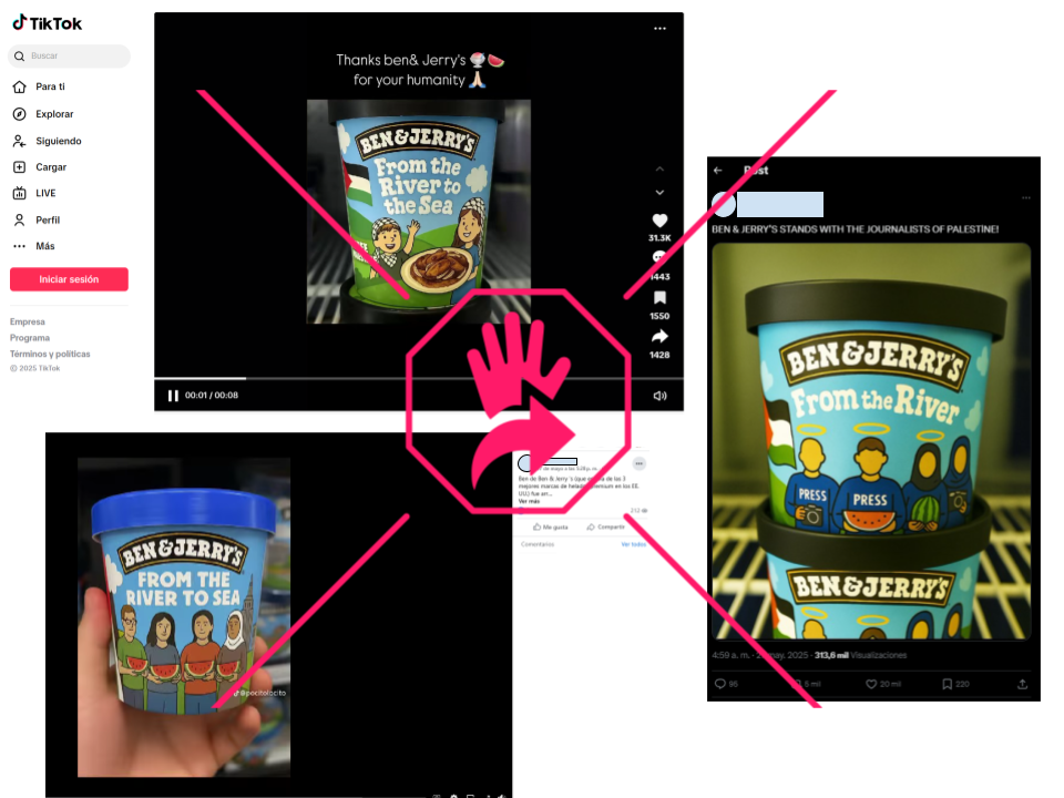 “Gracias Ben & Jerry´s por su humanidad”, se lee en inglés y en letras superpuestas en un video que circula en redes sociales, y en el que se ven seis diferentes cartones de helado con imágenes de personas con kufiyas (prenda distintiva de cuadros bicolor que usan los palestinos en la cabeza o el cuello), o con platos de sandía y pescados en las manos, y algunas de ellas con la frase “Desde el río hasta el mar” –muy usada por la causa palestina–; todo en formato caricaturizado, como suelen ser los diseños de los sabores de Ben & Jerry´s.