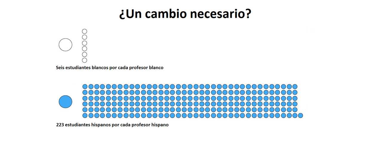 Para comparar, los blancos no hispanos conforman sólo el 31.8% de los estudiantes, pero el 73.9% de los profesores. Dicho de otro modo, son 223 alumnos hispanos por cada profesor hispano y 6.4 alumnos blancos no hispanos por cada profesor blanco no hispano.