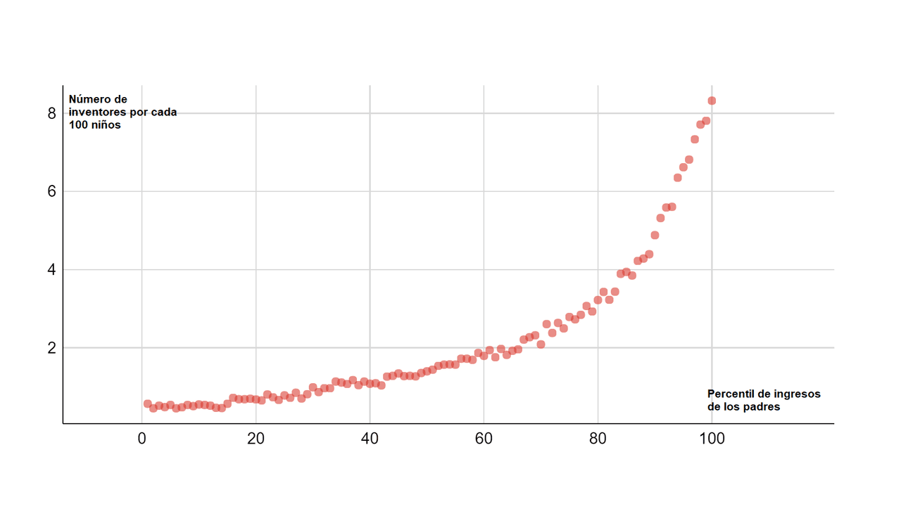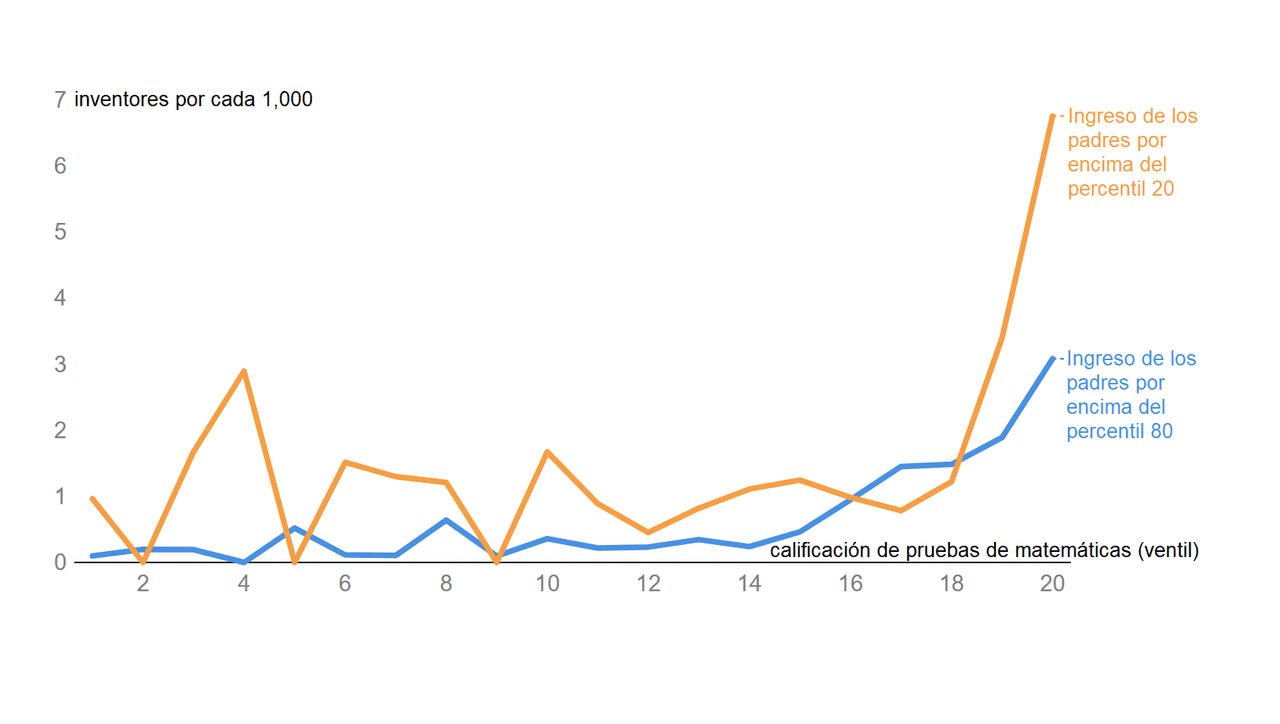 No es sorpresa que los inventores típicamente obtienen las calificaciones de matemáticas más altas. Más preocupante es que aunque los jóvenes de más alto desempeño de procedencias más privilegiadas llegan a innovar a tasas muy altas. Muchos niños igual de talentosos, pero de procedencias más modestas no lo llegan a hacer. Incluso entre los niños con más talento, la procedencia familiar sigue siendo el factor más determinante de quién se vuelve un inventor al crecer.