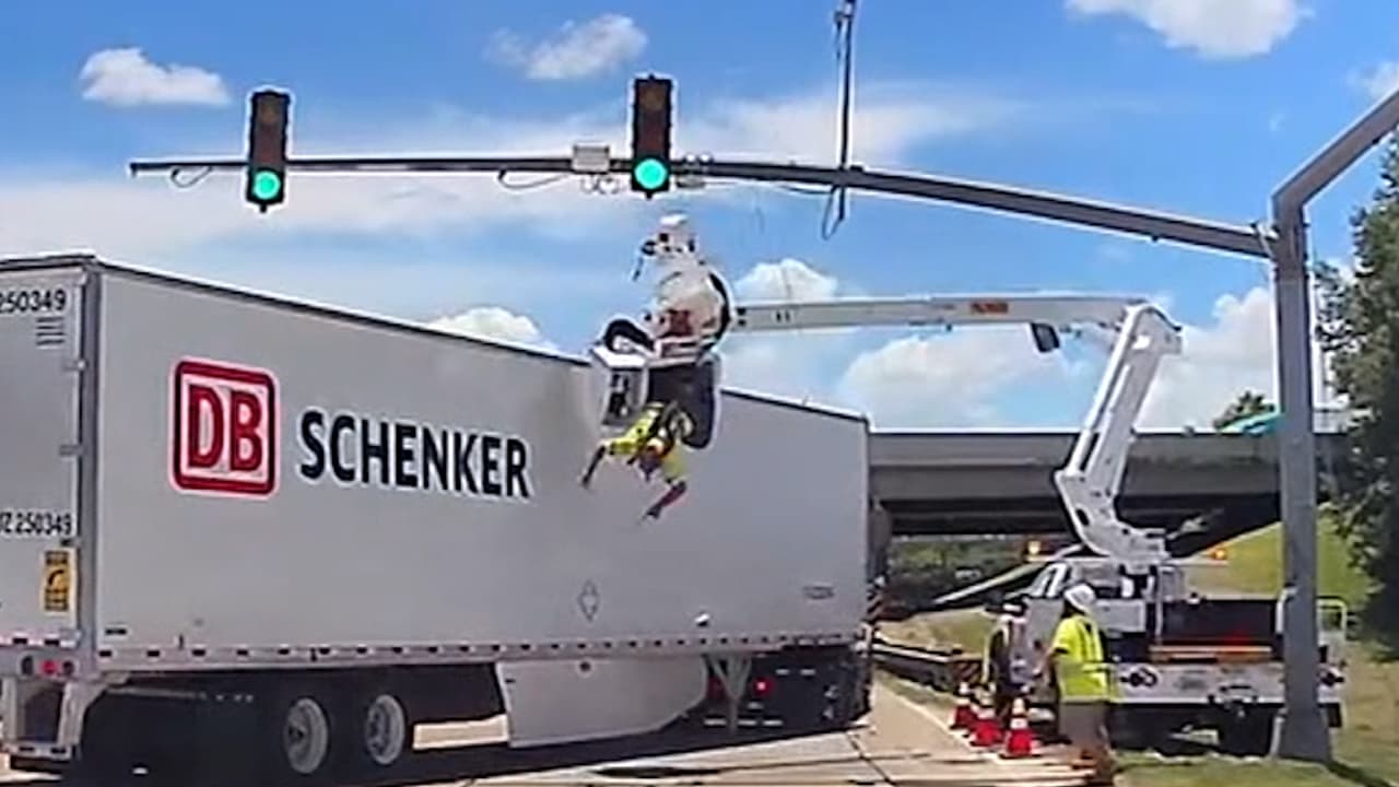 El arnés lo salvó: el momento en que un trabajador es arrollado cuando reparaba un semáforo