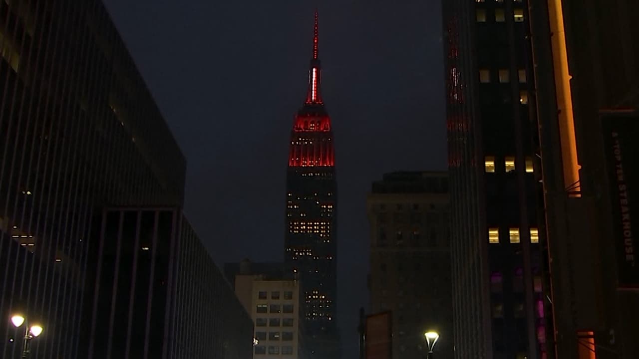 El icónico edificio de Nueva York emuló los colores de una sirena y los latidos de un corazón en sus pisos superiores para homenajear a los trabajadores que están combatiendo la pandemia desde primera línea en el estado más afectado del país.