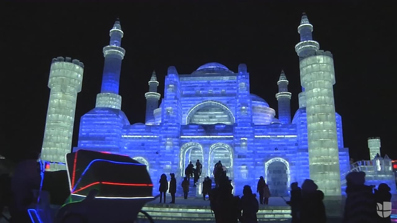 Las increíbles esculturas son hechas de bloques de hielo traídos del río Songhua y luego son tallados.