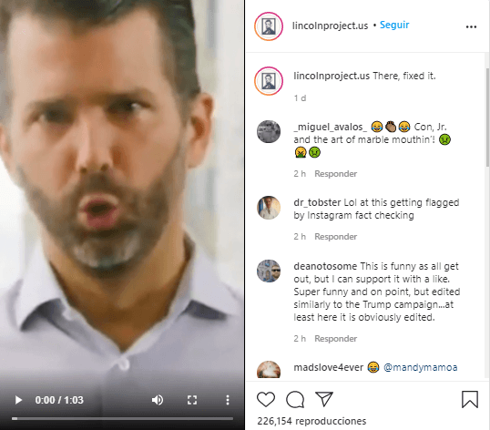 The Lincoln Project, un comité de acción política fundado por republicanos cuyo fin es la destitución de Donald Trump, publicó un video muy editado en el que parece que el hijo mayor del presidente está calificando las acciones de su padre como "conducta criminal" y que vendió Estados Unidos. El video fue creado reeditando un video más extenso que el propio Trump Jr. publicó atacando a Joe Biden para que parezca que en realidad está criticando a su padre.