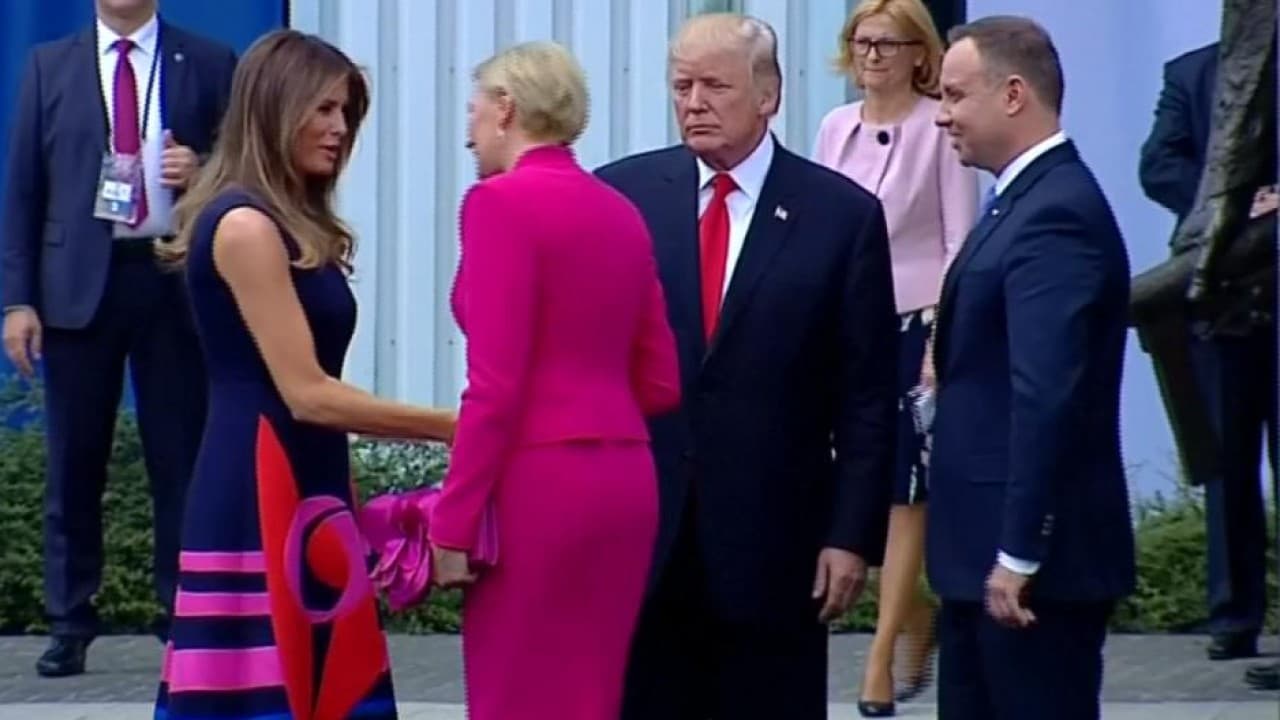 La primera dama polaca Agata Duda pasó por el lado de Trump sin saludarlo y lo dejó con la mano estirada, dirigiéndose directamente hacia la esposa del mandatario, Melania.