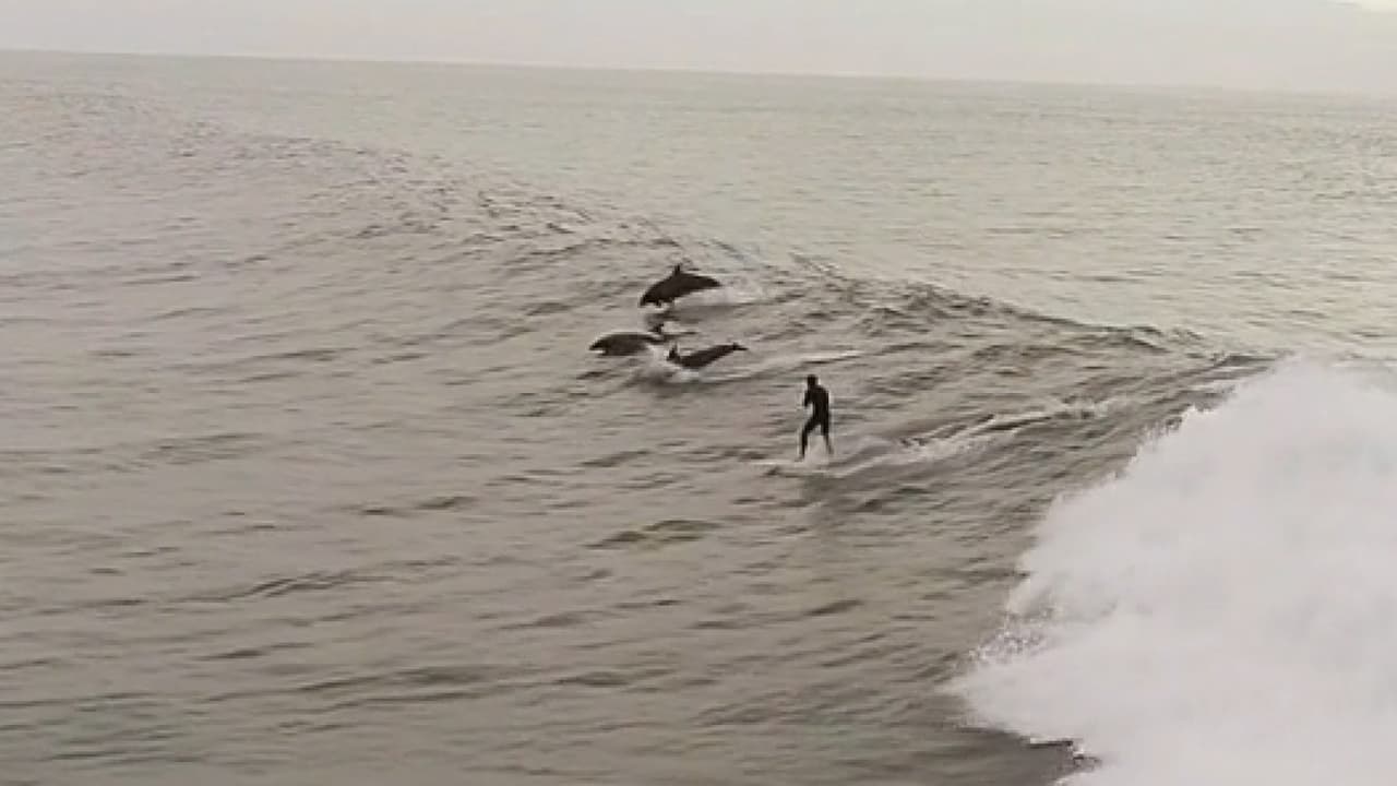 Un dron captó la imagen en la costa de Ventura del joven surfeando junto a al menos tres delfines, que saltaban las olas a su lado mientras él parecía no poder creerlo.