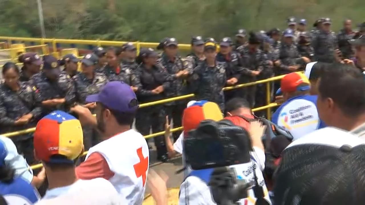 Luego de varios minutos frente a mujeres policías que impedían el paso hacia Venezuela, pasan los primeros voluntarios con la ayuda humanitaria por el puente fronterizo.