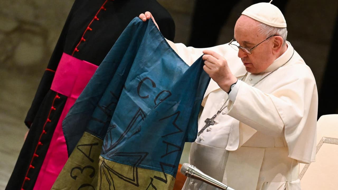 El momento en que el Papa besa una bandera de Bucha y condena la guerra en Ucrania