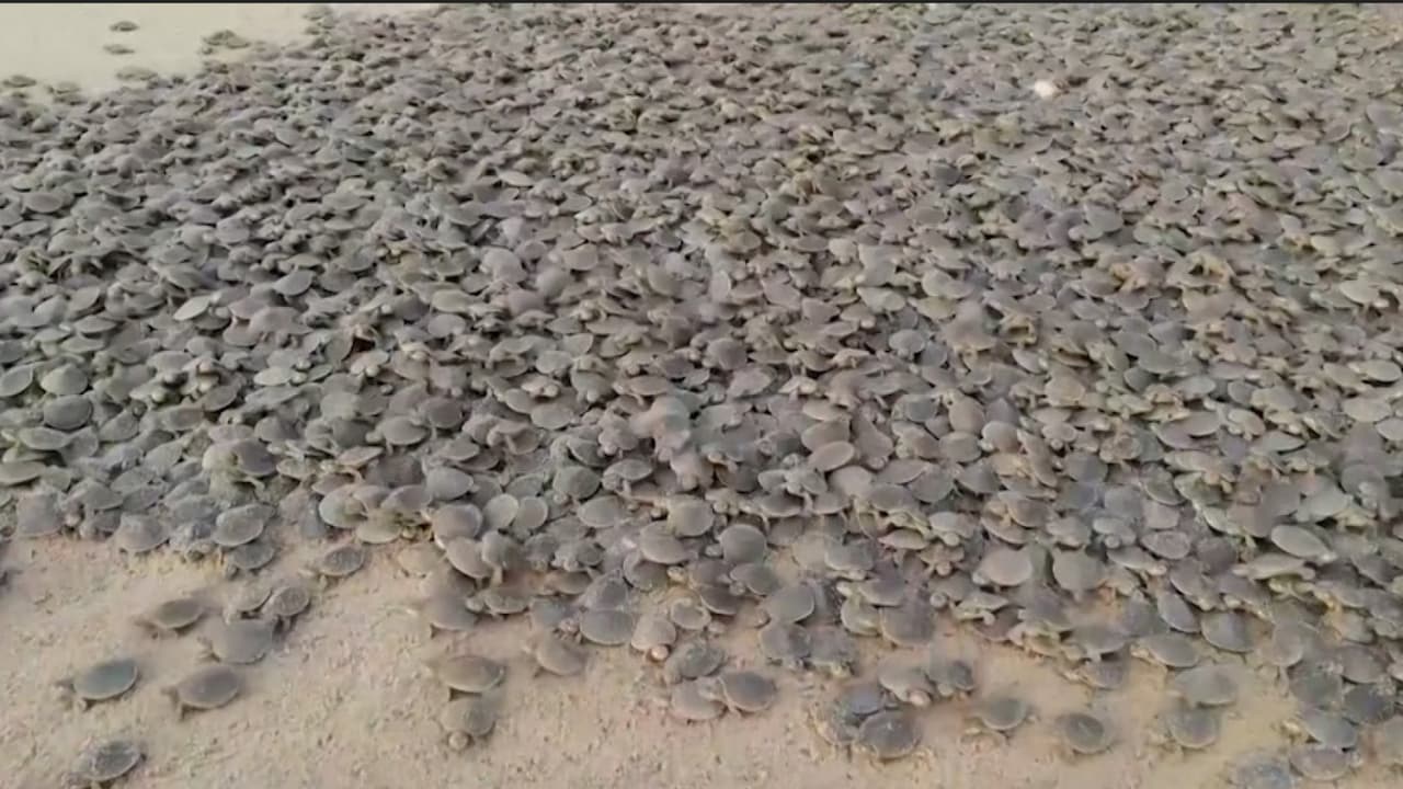 El momento en que miles de crías de tortugas gigantes emergen de la arena