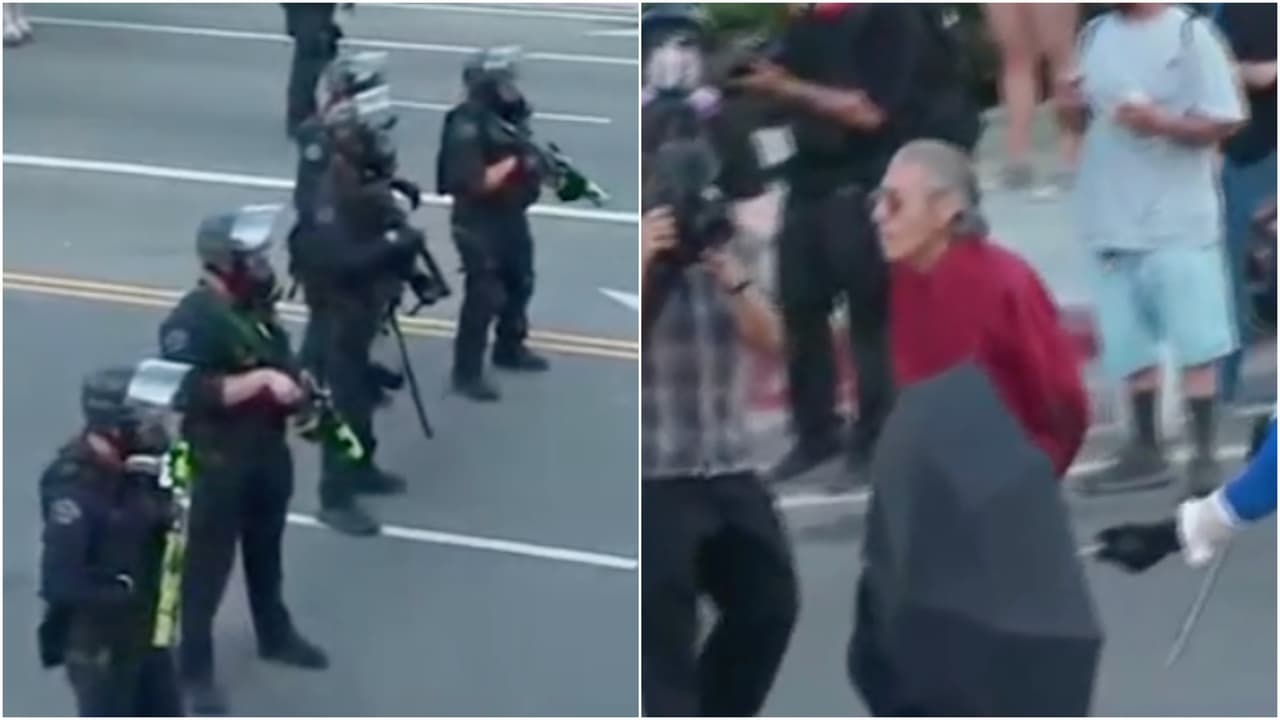 En medio de las protestas denominadas ‘No Kings’ en Los Ángeles, California, se registró en video cómo un manifestante de la tercera edad se paró frente a los oficiales que dispersaban a la multitud para hacerles reclamos mientras estos le apuntaban con sus armas advirtiéndole que no podía acercarse más.