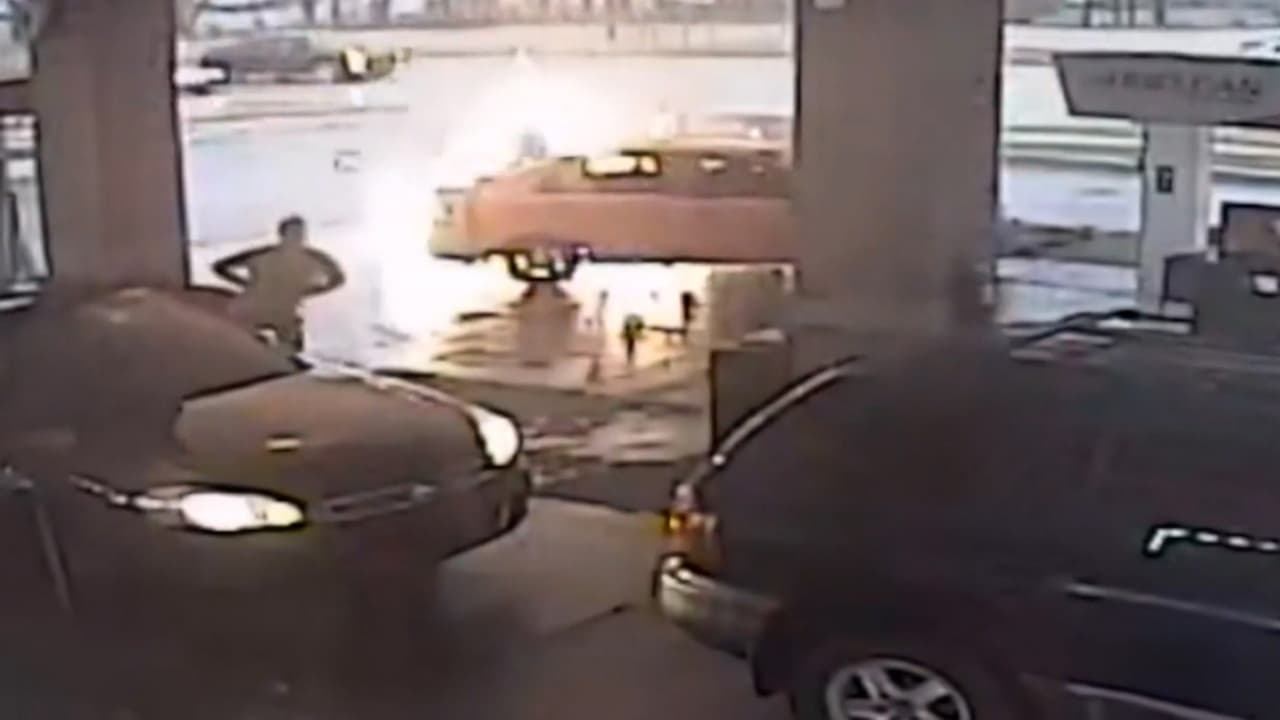 El momento en que un auto choca y prende en fuego una gasolinera