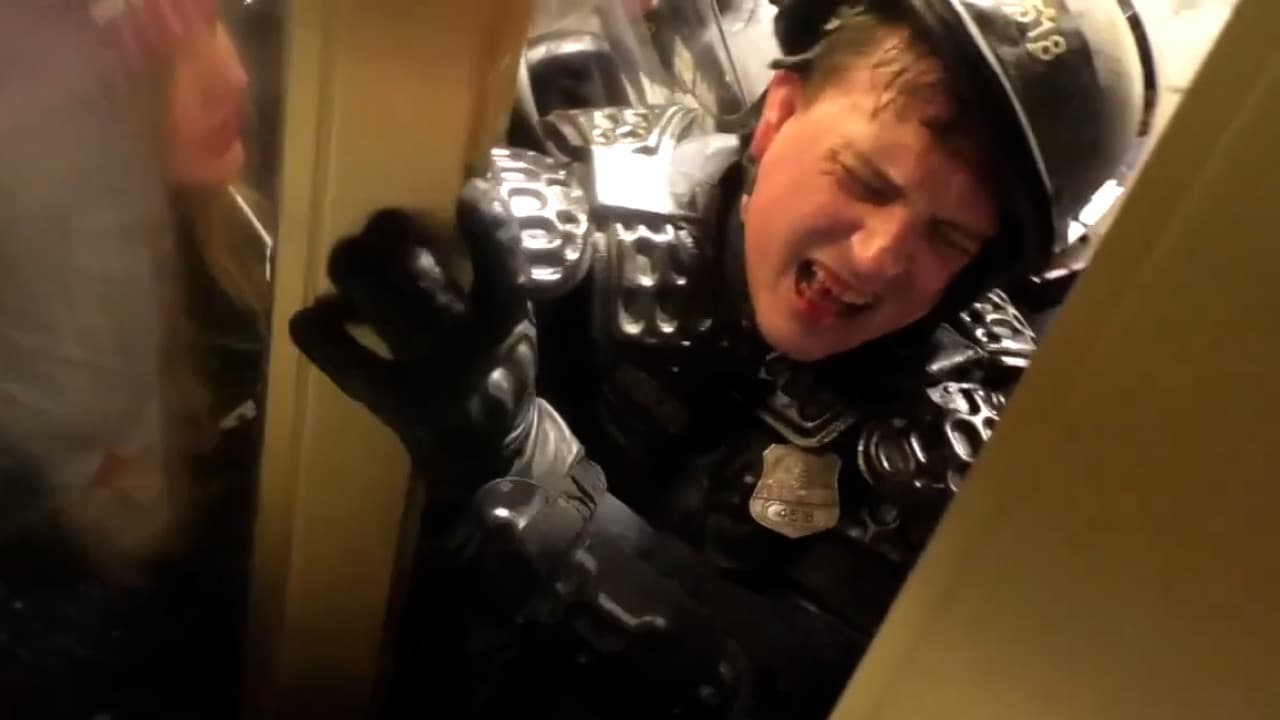 El momento en que un policía es aplastado por la turba que entró violentamente al Capitolio