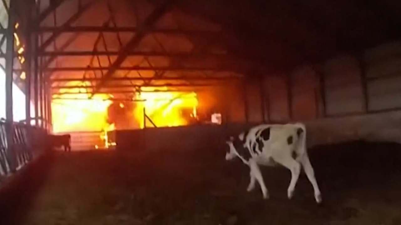 El momento en que un policía rescata a unas vacas de un establo en llamas