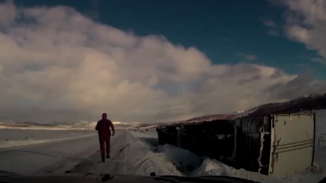 El momento en que un tráiler se vuelca por el hielo en una carretera (y cómo la nieve evita una tragedia)