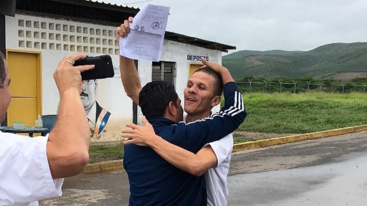El momento en que uno de los tres parlamentarios que excarceló el gobierno de Venezuela, sale de prisión