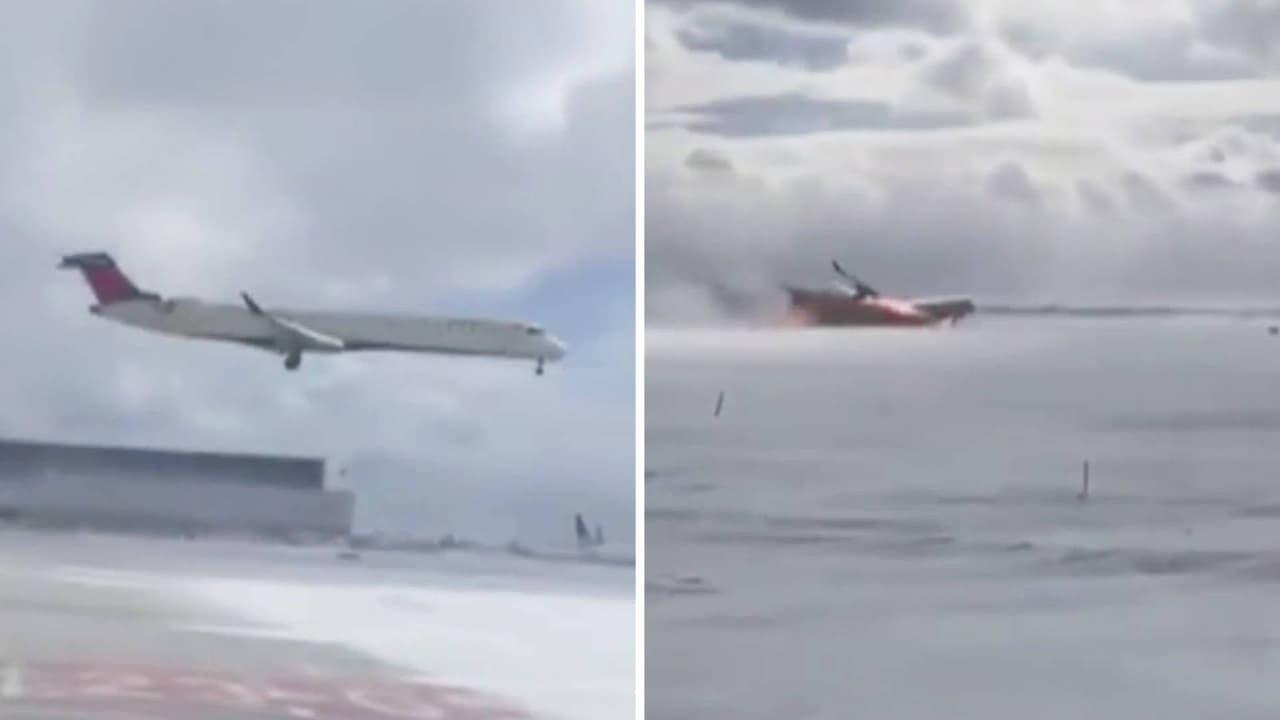En video quedó captado el momento en que un avión de pasajeros de Delta Airlines aterriza en el Aeropuerto Internacional Pearson de Toronto, Canadá. La aeronave se volcó y terminó en llamas en medio de fuertes ráfagas de viento. El avión permanecerá en la pista del aeropuerto mientras investigadores recopilan evidencia.
