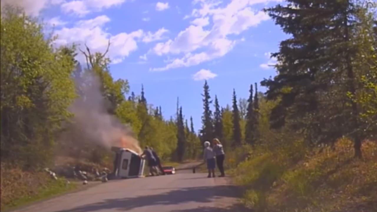 La cámara de una patrulla en Alaska grabó el rescate de un hombre atrapado en un vehículo en llamas. El policía recurrió a la ayuda de transeúntes para poder liberar al indviduo.