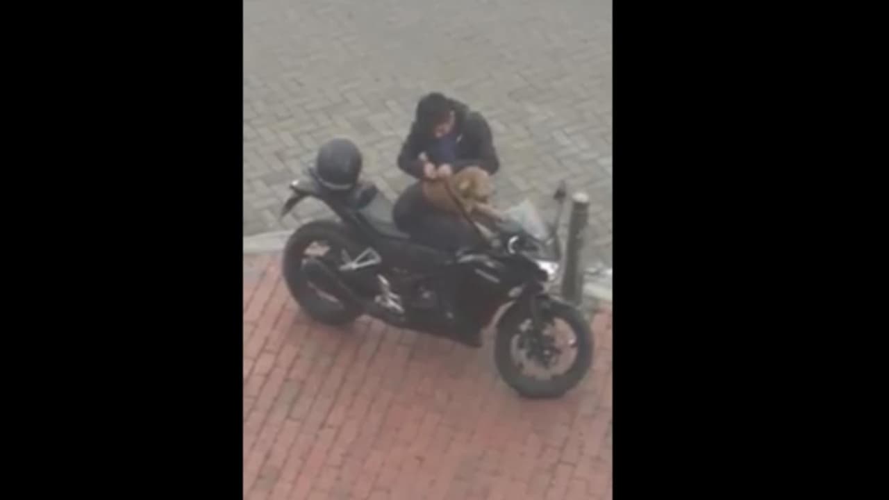 El animal da un salto para treparse en la motocicleta y espera pacientemente a que su amo lo vista antes de recorrer la ciudad.