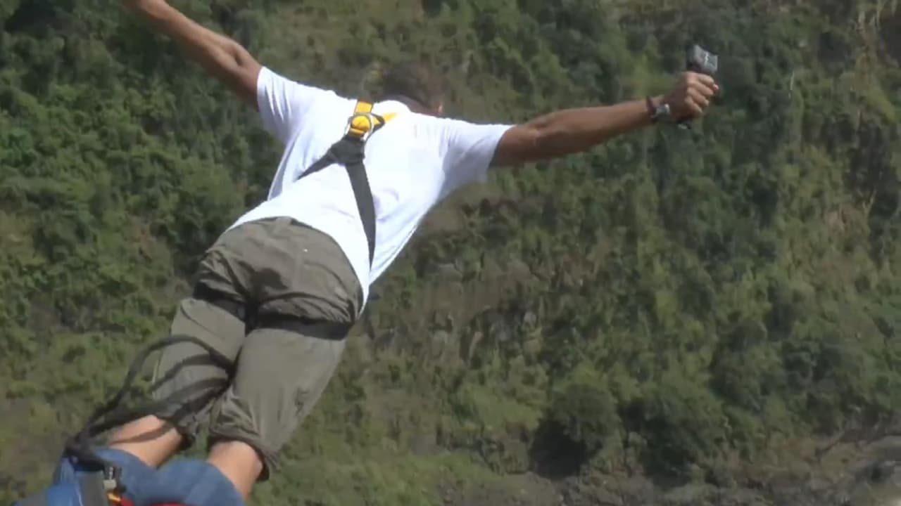 El actor se filmó a sí mismo con una cámara Go Pro mientras realizaba el infartante salto de 'bungee'. La estructura desde donde se lanzó está ubicada en las espectaculares Cataratas Victoria de Zimbabue, en África.