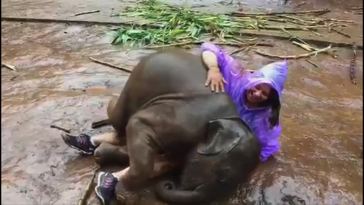 La estadounidense Hannah Frenchick se fue de vacaciones a Tailandia el año pasado. Como parte de su viaje, visitó un refugio de elefantes y se encontró con un elefante bebé muy juguetón que la dejó embarrada en el piso y a las risas.
