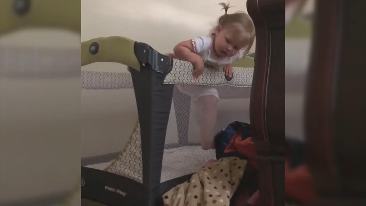 Usando sus mantas y algunos juguetes para acolchonar su caída, esta traviesa niña se escapa de su corral protagonizando un increíble escape que solo se puede creer gracias a que su monitor estaba encendido grabando el momento.