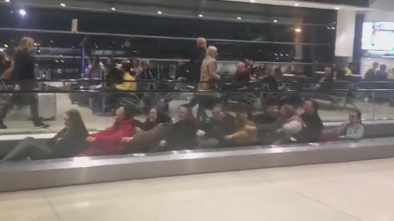Un equipo de baile se entretuvo en una correa caminadora vacía en el aeropuerto de Dublín, sentándose en fila y remando como si fuesen navegando, mientras esperaba su vuelo a Londres.