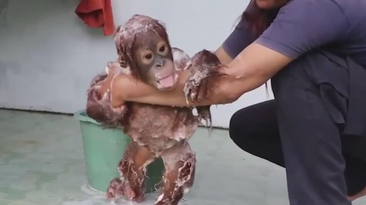 El videíto: Este bebé orangután recibe su primer baño de espuma