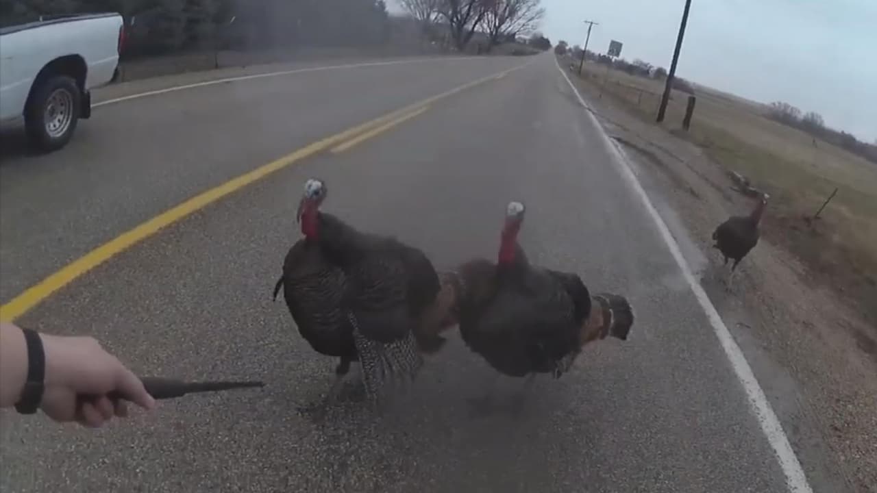 El videíto: Este policía intentó sacar de la carretera a unos pavos y estos casi lo sacan a él