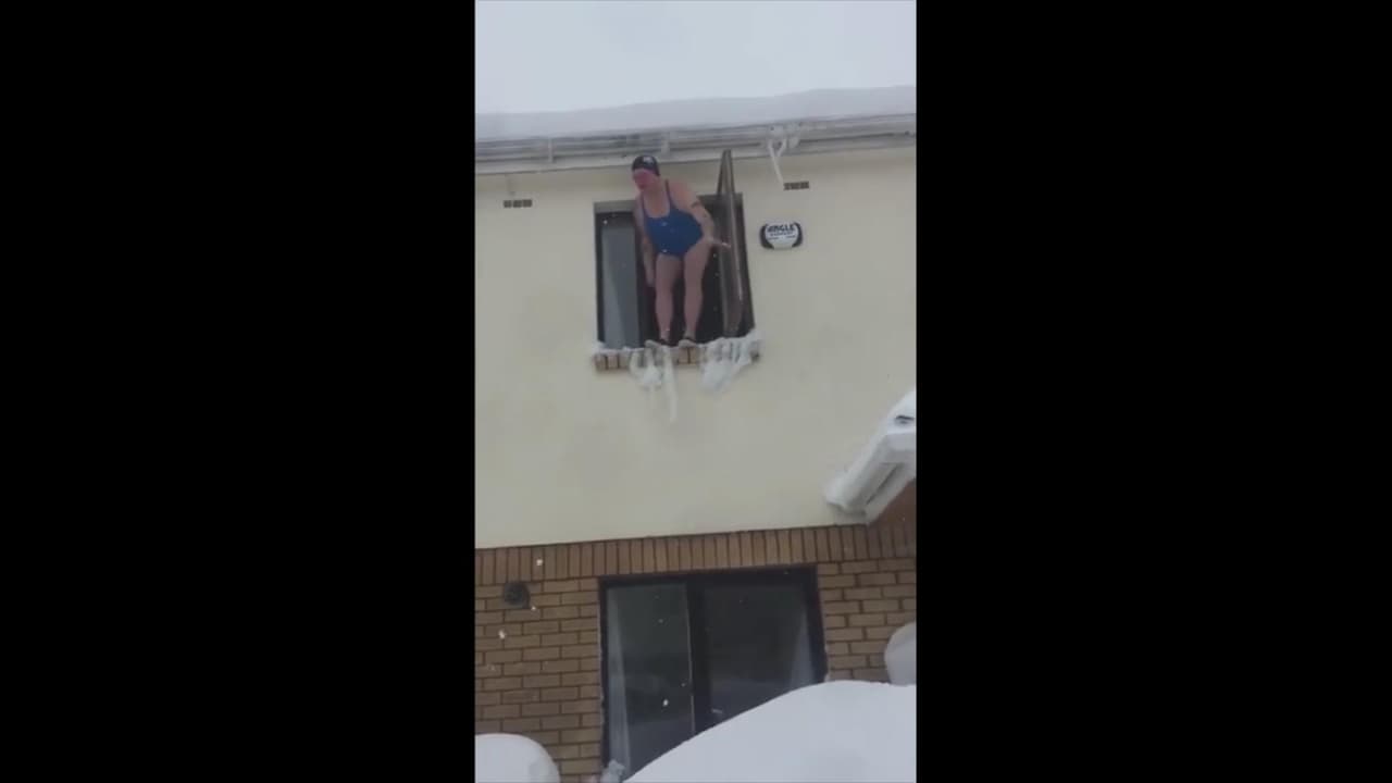 Este hombre vestido con traje de baño saltó de un segundo piso a una montaña de nieve.