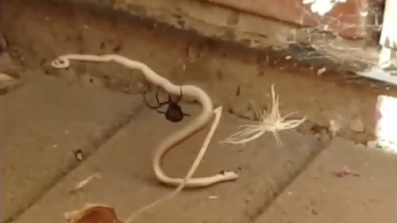 Una serpiente venenosa australiana intentaba deslizarse hacia el interior de una casa cuando quedó atrapada en las redes de una araña espaldaroja, también venenosa. Ambas se liaron en un violento combate que finalizó con una victoria inesperada.