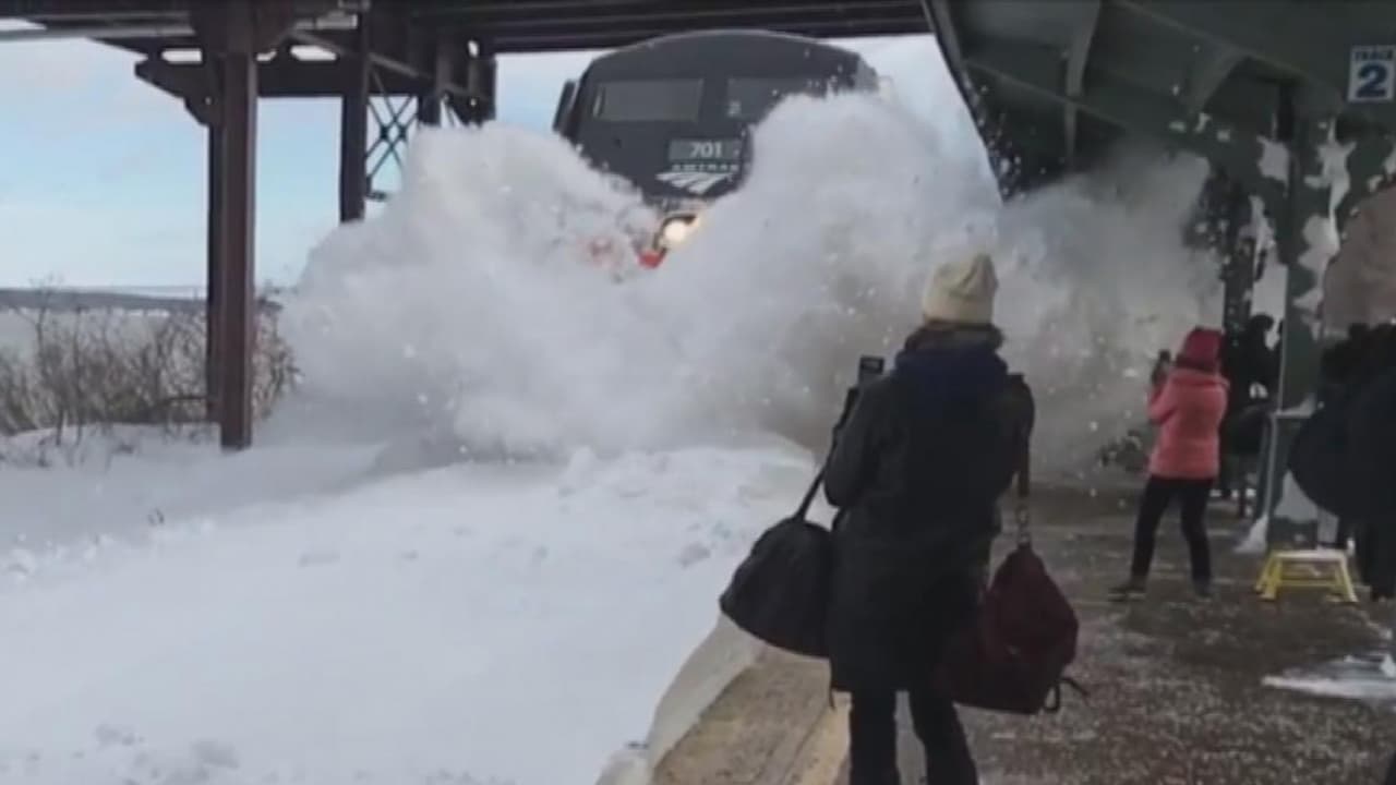 El videito: un tren lanza una gran ola de nieve sobre los pasajeros que esperaban en una estación
