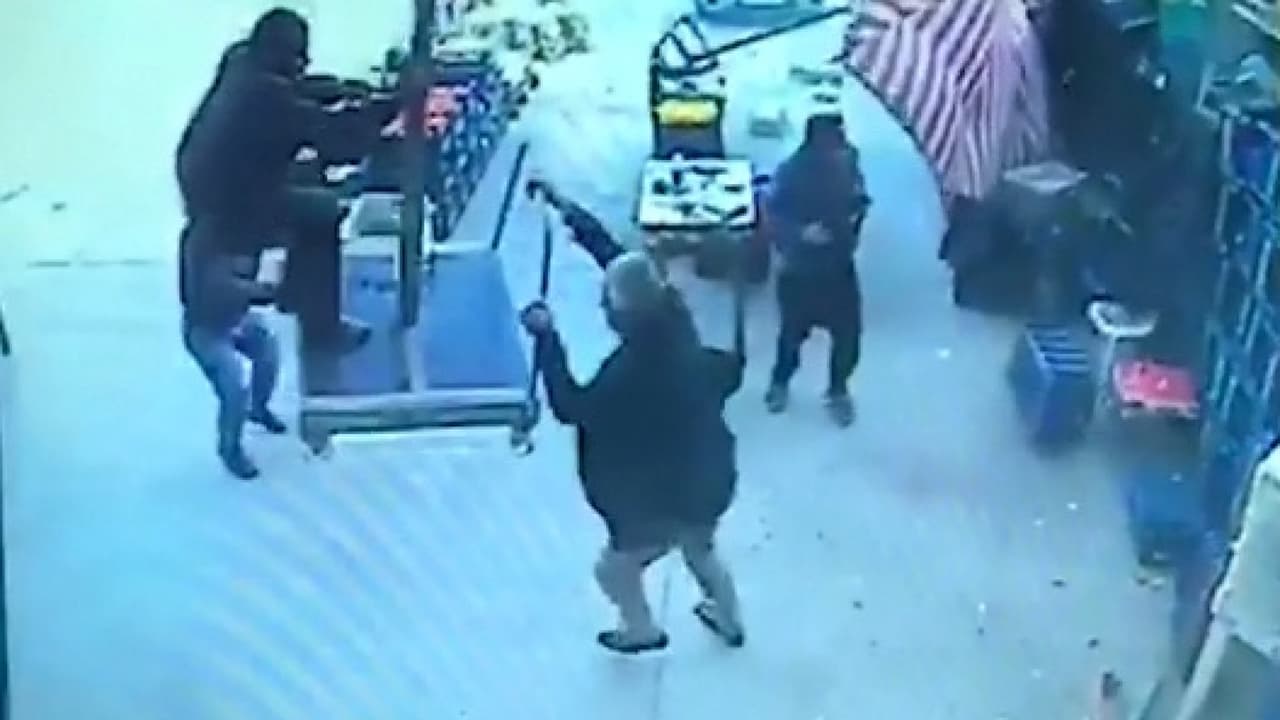 Una fuerte ráfaga se llevó varios metros hacia el cielo la sombrilla y el hombre que la estaba agarrando para protegerla del viento en un mercado de Turquía.