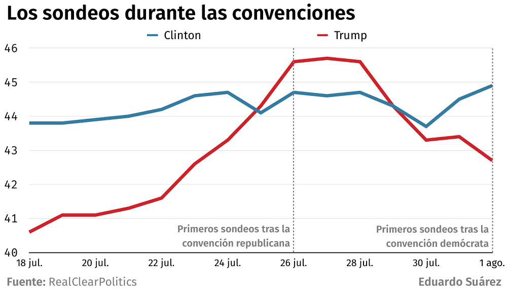 Donald Trump ganó unos cinco puntos durante la Convención Nacional Republicana en Cleveland según el promedio de sondeos que elabora RealClearPolitics. Su adversaria apenas ha subido un punto desde entonces en ese promedio pero el cónclave de Filadelfia ha sido muy dañino para Trump, que ha perdido tres puntos de los cinco que había ganado desde el inicio de su convención. El candidato republicano inicia el mes de agosto unos dos puntos por detrás de Clinton aunque mucho más cerca que durante la mayor parte de 2016.