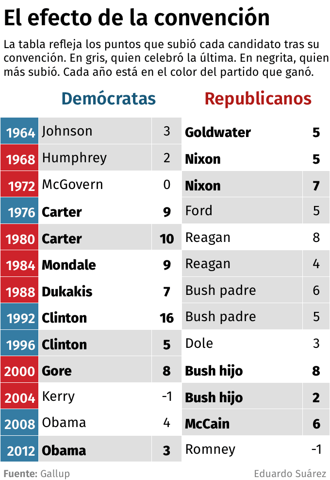 Antes de hacerlo, merece la pena examinar las cifras desde 1964. Así subió o bajó cada candidato después de su convención.
