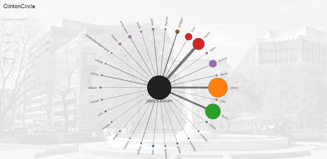 Empleando una herramienta desarrollada por expertos del grupo Macro Connections llamada Immersion, investigadores colocaron allí los casi 30,000 mails ‘privados’ desde o hacia la dirección hdr22@clintonemail.com de Hillary Clinton (que son de dominio público) y que ya habían sido publicados por WikiLeaks. En esta visualización, identificaron las rutas de esos mensajes: cuántos correos electrónicos, quién los envió y a quién.