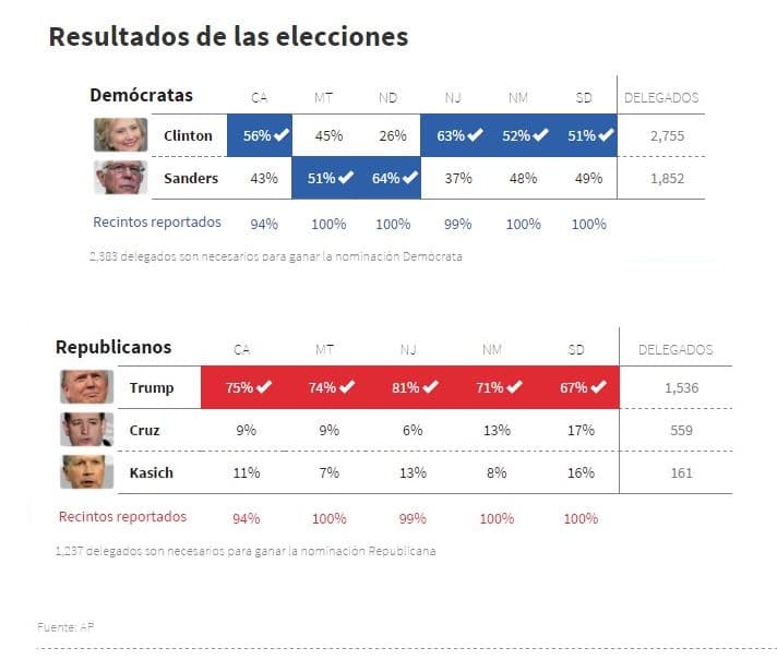 La jornada electoral más esperada de las primarias, cuando votaron California, Nueva Jersey, Nuevo México, Montana, Dakota del Norte y Dakota del Sur, nos dejó momentos históricos, y un par de sorpresas.