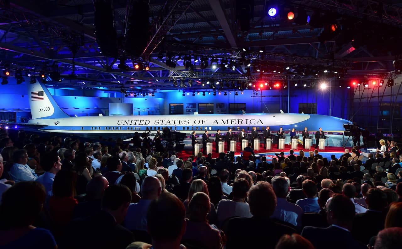 También en esta campaña presidencial se celebró un debate republicano con avión de fondo, en septiembre de 2015. Era el Air Force One que sirvió a siete presidentes entre 1973 y 2001. La puesta en escena de CNN fue televisivamente atractiva, pero celebrar el debate dentro de la Biblioteca Presidencial Ronald Reagan provocó auténticos problemas de calor y sudor a los candidatos. Por aquel entonces, eran 11 aspirantes sobre el escenario.