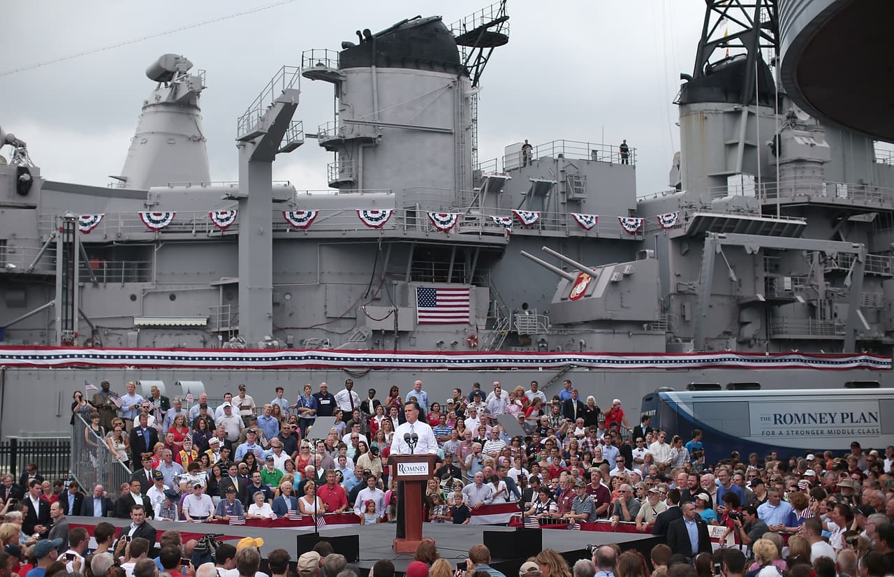 Y unos meses antes, en verano de 2012, Romney usó un buque de guerra de 40,800 toneladas y 270 metros de eslora para anunciar que Paul Ryan era su candidato a la Vicepresidencia. Salieron de la embarcación en un evento en una base naval en Norfolk, Virginia.