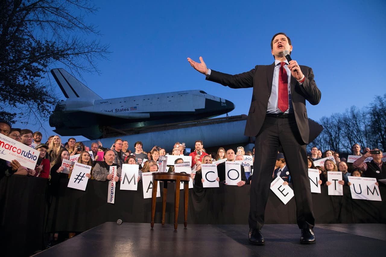 Este mismo sábado el senador Marco Rubio, ahora mismo el máximo contricante de Trump, pronunció un discurso en el Space and Rocket Center en Huntsville, Alabama. Habló con el Space Shuttle Orbiter Pathfinder de fondo, una maqueta de un transbordador espacial.