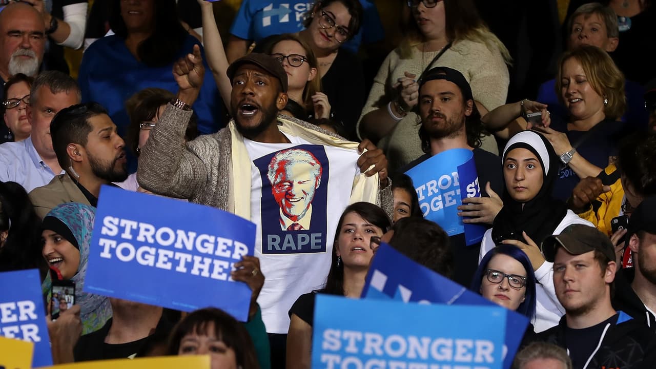 Este manifestante tenía una camisa con la foto de Bill Clinton y la palabra 'violador' durante un discurso de Hillary Clinton en Detroit.