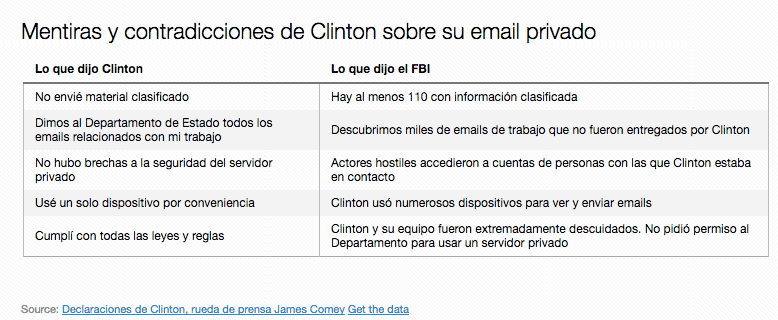 Comey lanzó varias afirmaciones que demuestran que Clinton y su campaña no han sido completamente honestos a lo largo del último año y medio, contradiciendo buena parte de la defensa de la ex funcionaria del gobierno de Barack Obama.