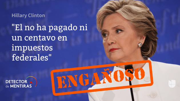 9. Clinton no tiene argumentos para asegurar que Trump no pagó un centavo de impuestos (o al menos no lo ha demostrado). Es una afirmación engañosa. El candidato republicano no ha publicado declaraciones de impuestos en las últimas décadas, así que no hay cómo asegurarlo.