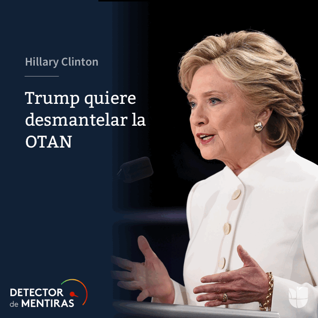 3. Clinton acusa a Trump de querer destruir a la OTAN. Esta afirmación de la candidata demócrata es falsa. Si bien Trump ha dado declaraciones polémicas sobre la Organización del Tratado del Atlántico Norte (OTAN), el magnate republicano no ha dicho en público que pretende destruir la entidad. Mira la argumentación aquí.