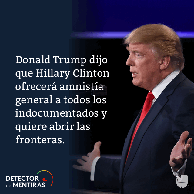 2. Trump insiste en una amnistía general por parte de Clinton, pero sigue mintiendo. Ninguna propuesta de Clinton habla de amnistía. La demócrata quiere una reforma migratoria pero los indocumentados tendrían que pasar una serie de pasos para ser legalizados, como explicamos en el Detector de Mentiras.