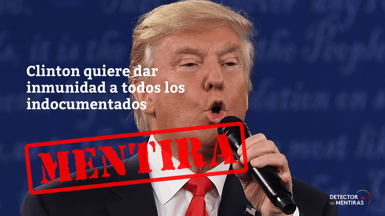 Trump dice que Clinton quiere otorgarle amnistía a todos los indocumentados. Es una mentira que ha dicho repetidamente. Cuando revisamos las propuestas migratorias de Clinton, en ningún lugar se habla de acabar con la seguridad en las fronteras y eliminar toda norma migratoria. Sí es verdad que Clinton espera dar alivios migratorios en sus primeros 100 días como presidenta, si es elegida.
